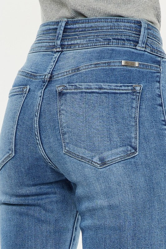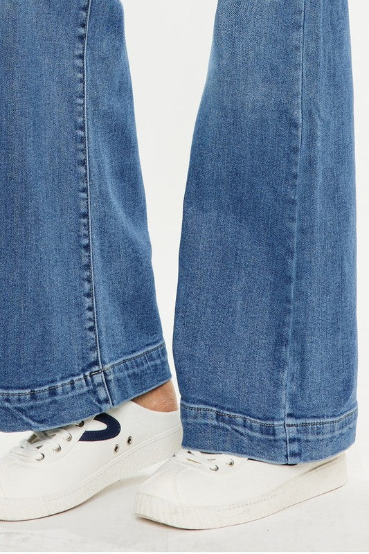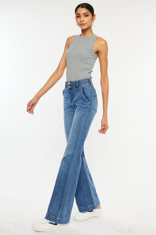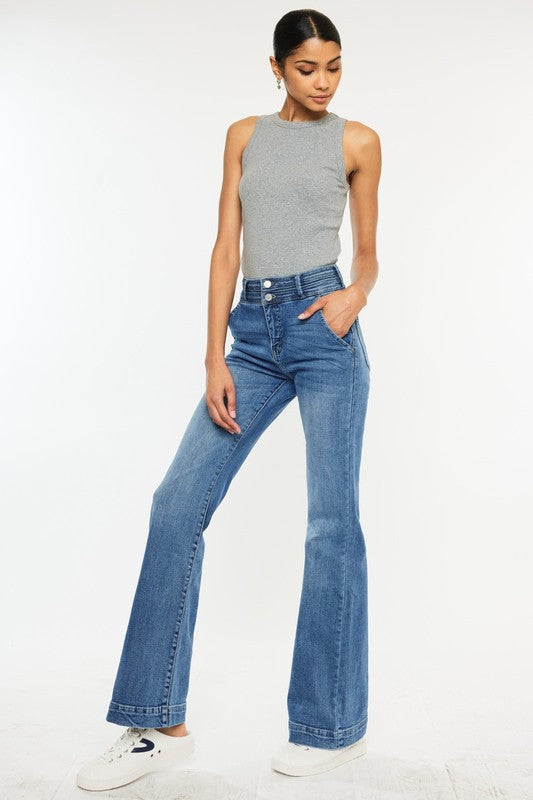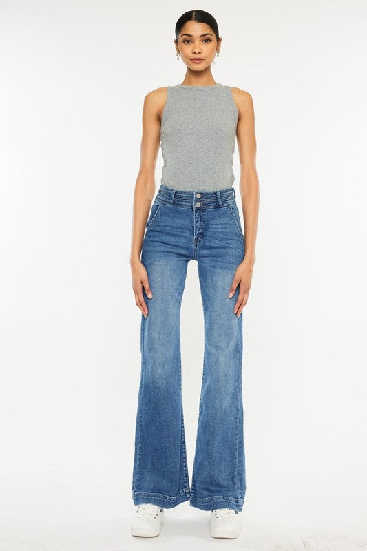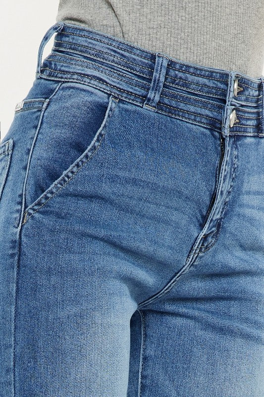 DOUBLE HIGH RISE HOLLY FLARE JEANS WIDE FLARE FIT MEDIUM STONE WASH STRETCH WIDE WAIST BAND W/ DOUBLE BUTTON SLANT POCKET WIDE REG HEM ZIP FLY RISE-11" INSEAM- 33" IN SIZE 5/26